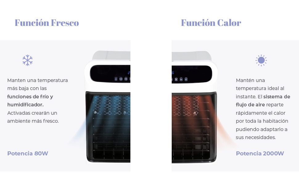 Função de aquecimento a frio:O tanque de capacidade de 12l junto com as duas bolsas de gelo permitem que o ar condicionado evaporativo expele o ar frio para obter uma temperatura mais baixa nos dias mais quentes. Graças à sua função de calor, você manterá uma temperatura ideal instantaneamente. O sistema de fluxo de ar espalha rapidamente o calor por toda a sala, permitindo que se adapte às suas necessidades com suas duas potências (até 2000w).