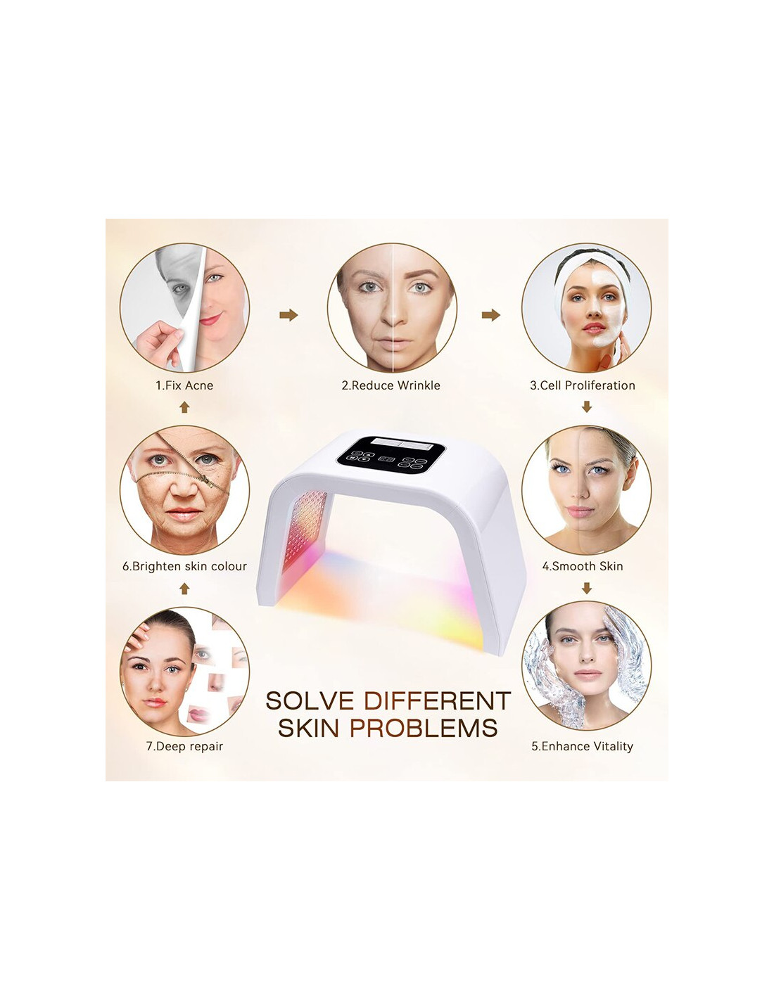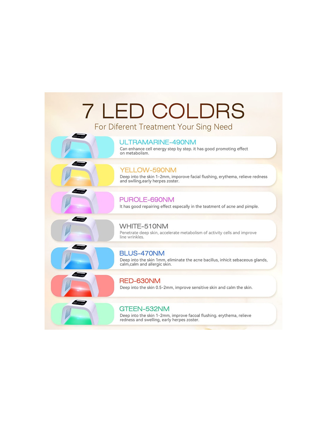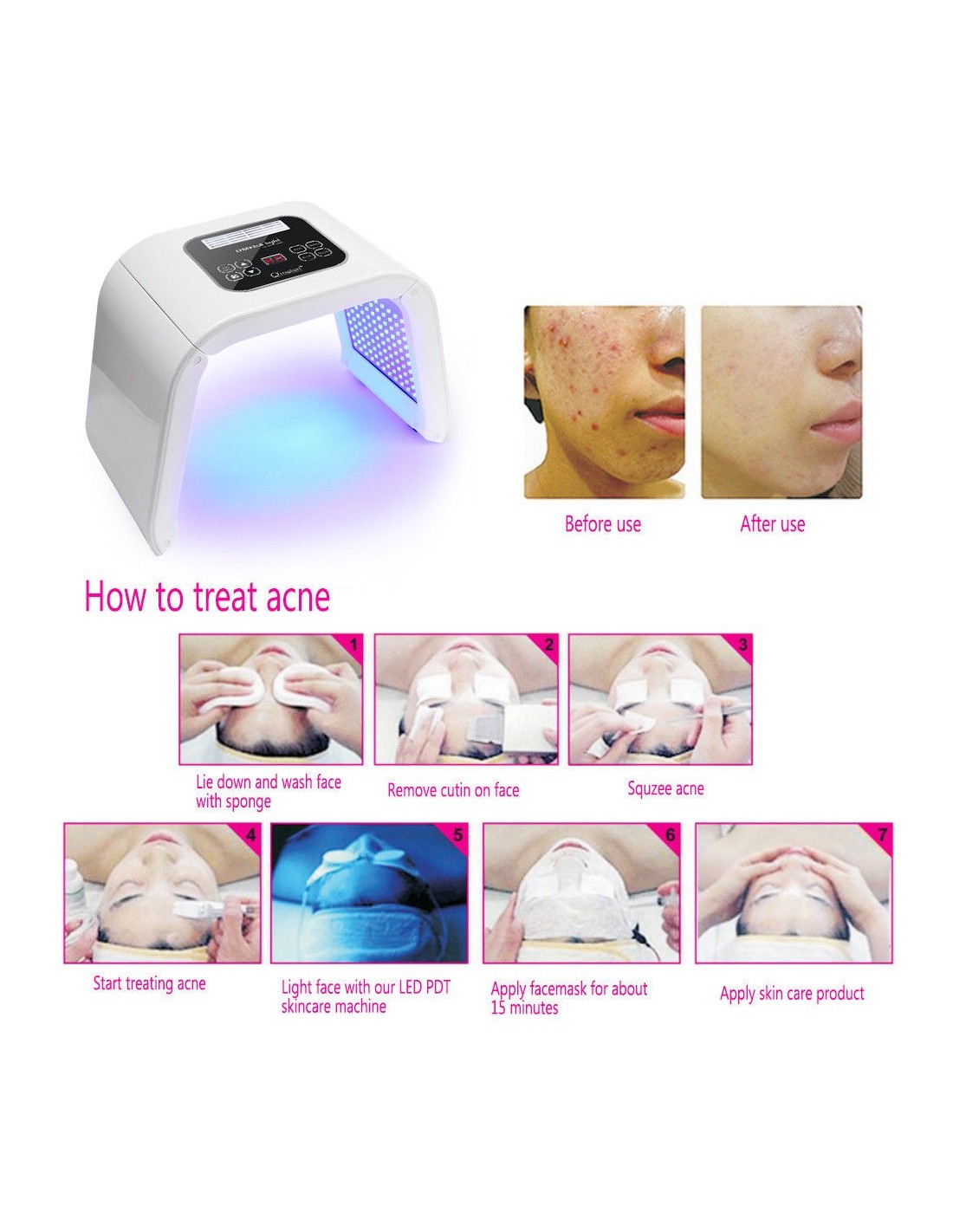 As experiências efetuadas já provaram que se podem conseguir os resultados de rejuvenescimento, fazendo um uso específico do comprimento de onda da luz emitida pela luz LED (díodo emissor de luz) e com o seu uso prolongado. O efeito de beleza é semelhante ao produzido pelo tratamento a lazer, mas sem nenhum efeito secundário. Para além disso, pode-se utilizar com outros produtos de beleza como máscaras faciais descartáveis, porque melhora a absorção da pele.