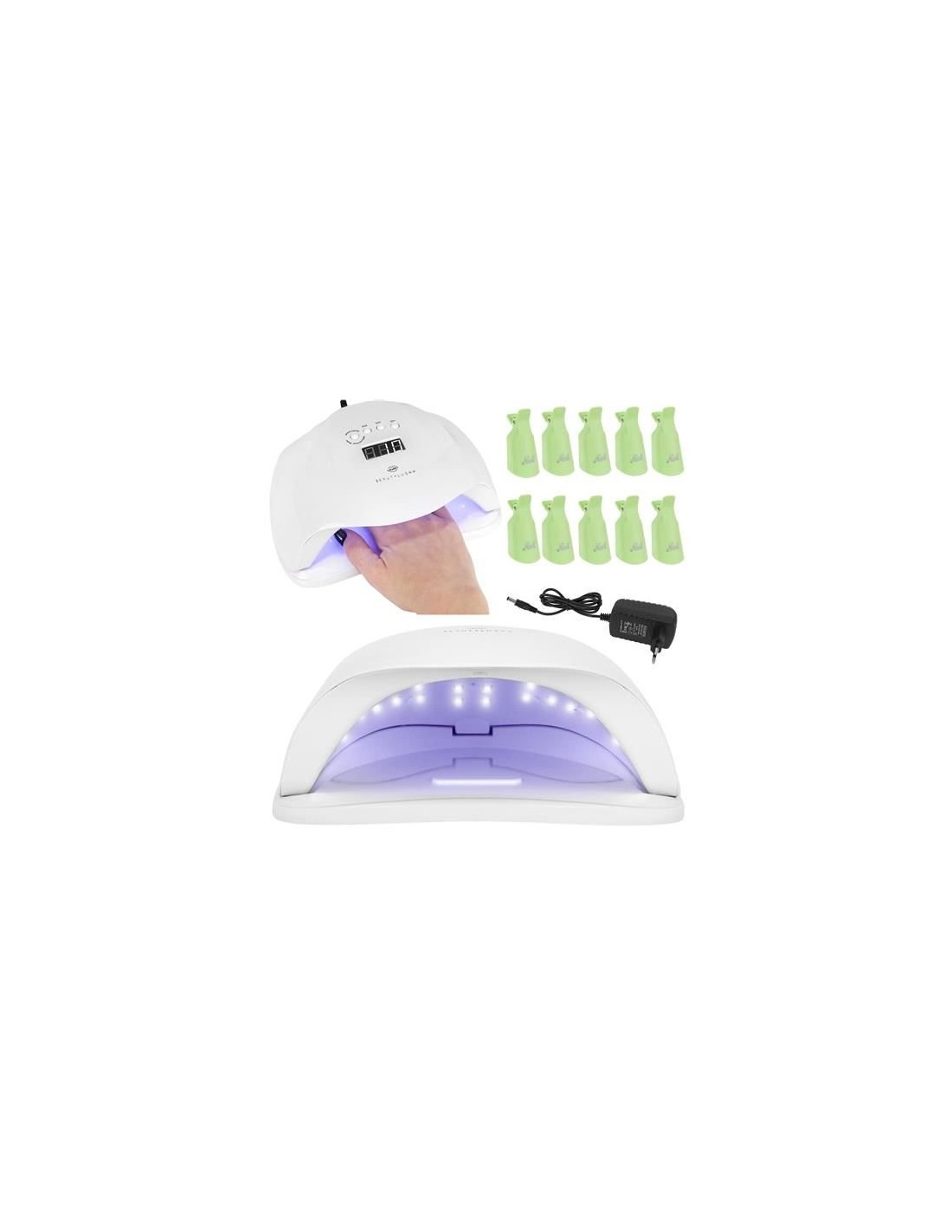 SENSOR DE MOVIMENTO - a lâmpada acende automaticamente quando você insere a mão nela, o que melhora o conforto de uso e ajuda a economizar a energia necessária para operar o dispositivo. O conjunto está incluído gratuitamente! 10 clipes para remover híbridos. Graças à sua aplicação, o verniz irá desaparecer facilmente e as unhas permanecerão intactas.