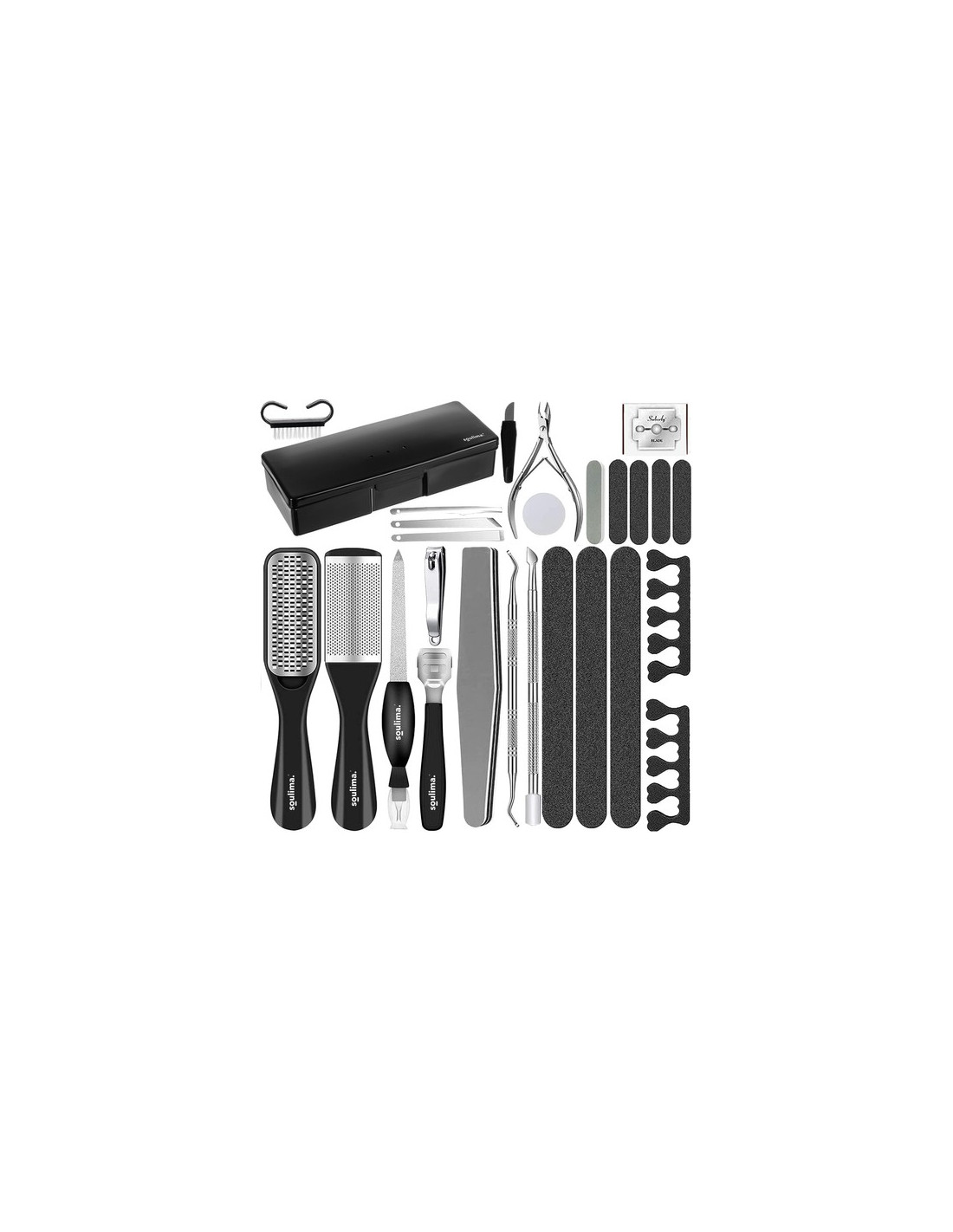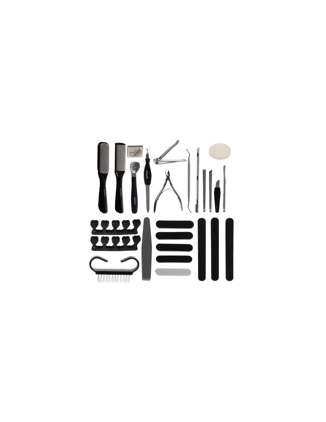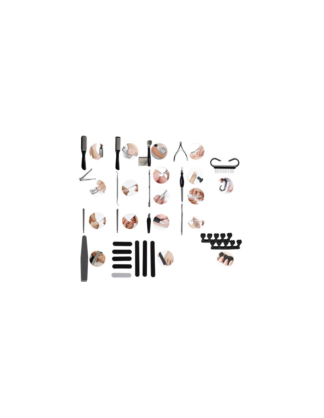Inclui 31 elementos, entre: limas, raladores, pincel, alicate, serrilhado e muitos outros acessórios, todos embalados em um estojo estético.