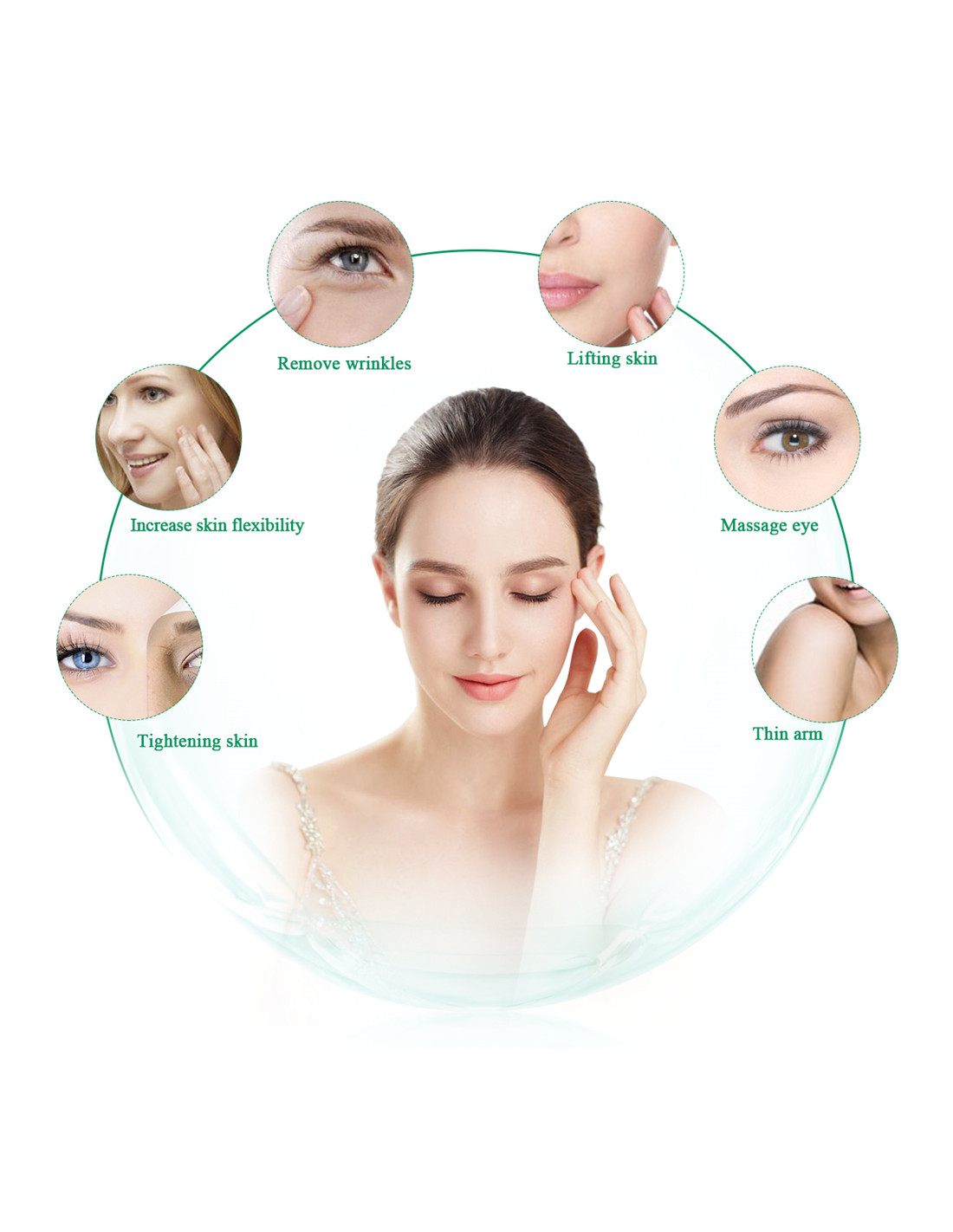 Manipulo para melhorar o rejuvenescimento: o uso de positivo e negativo micro-corrente energia de ativação de células da pele de lançamento, de modo que a síntese rápida de colagénio fibroblastos, seja estimulada tornando a pele mais elástica revertendo o aspeto original, o colagénio é estimulado causando por toda a pele a estimulação de tensão muscular que é aumentada, gradualmente, eliminando rugas, prevê o envelhecimento da pele, restaurando a elasticidade da pele, facial.