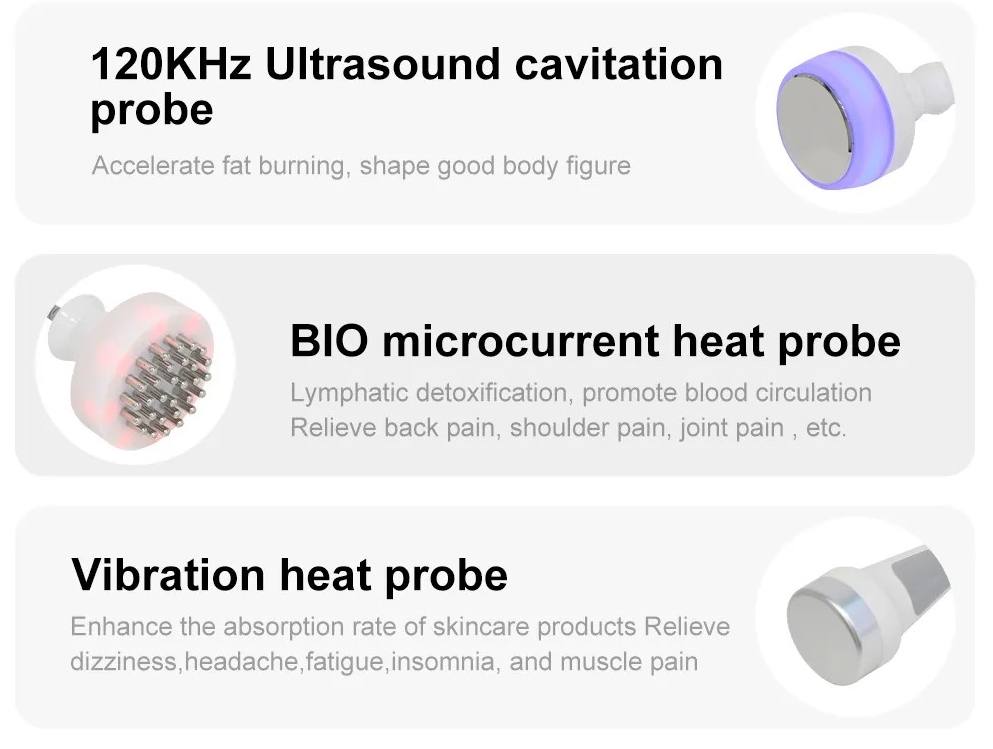 2. Funções múltiplas -- Redução de gordura , forma do corpo, levantamento da pele do corpo inteiro, drenagem linfática, alívio da dor, etc.