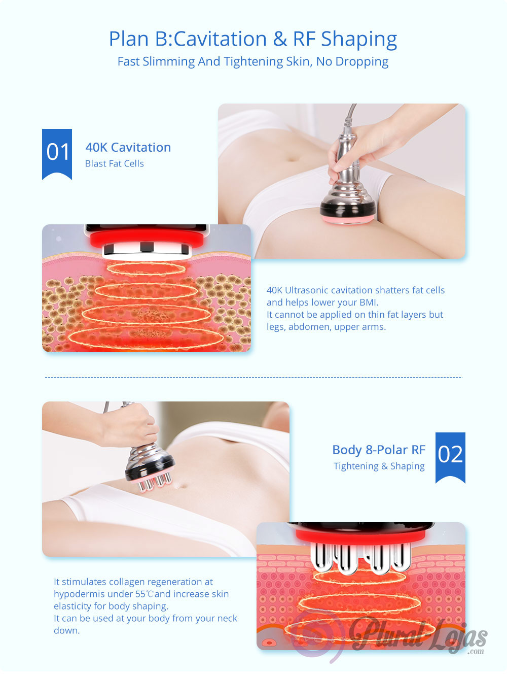 Com a cabeça com forte onda sonora de 40KHZ pode ser emitida ao corpo humano para influenciar as células de gordura ferozmente, causando movimento entre as células de gordura. Isto pode causar consumo efectivo de calorias e de umidade nas células de gordura e reduzir o tamanho das células de gordura. Dá-se uma implosão das células adiposas(são eliminadas) as ondas de som provoca vibração causando impacto feroz das células de gordura para reduzir a quantidade de células de gordura e, assim, atingir os efeitos da remoção de gordura.