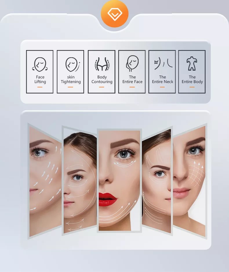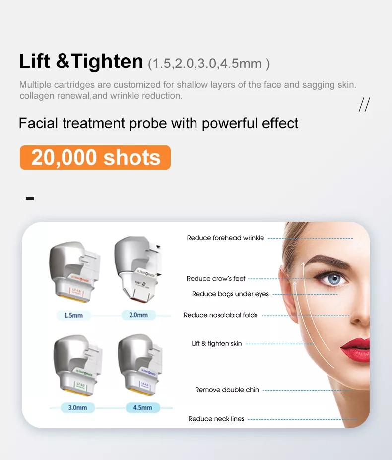 - Tratamento facial: Comparado com o HIFU normal, todo o tratamento é confortável e indolor e pode atingir mais profundamente a pele. Por isso, tem melhores resultados no lifting facial e na remoção de rugas.