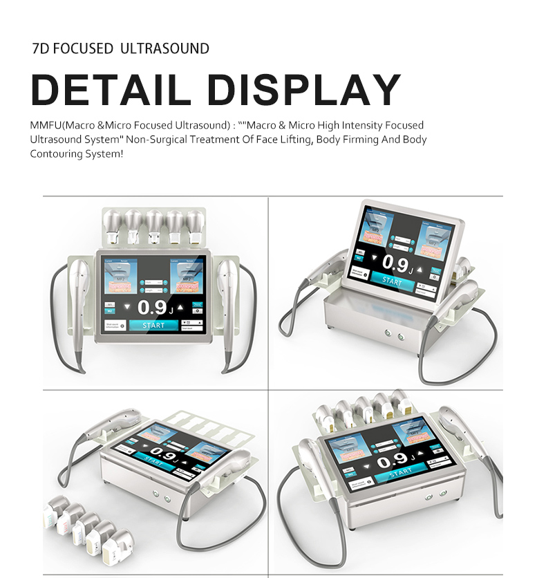 A máquina 7D HIFU é a mais recente tecnologia para lifting facial, remoção de rugas e modelagem corporal. A tecnologia é desenvolvida pela primeira vez como um produto chamado 7D HIFU, usa a tecnologia MMFU (micro e micro ultrassom focalizado), o transdutor gera calor na área de foco.