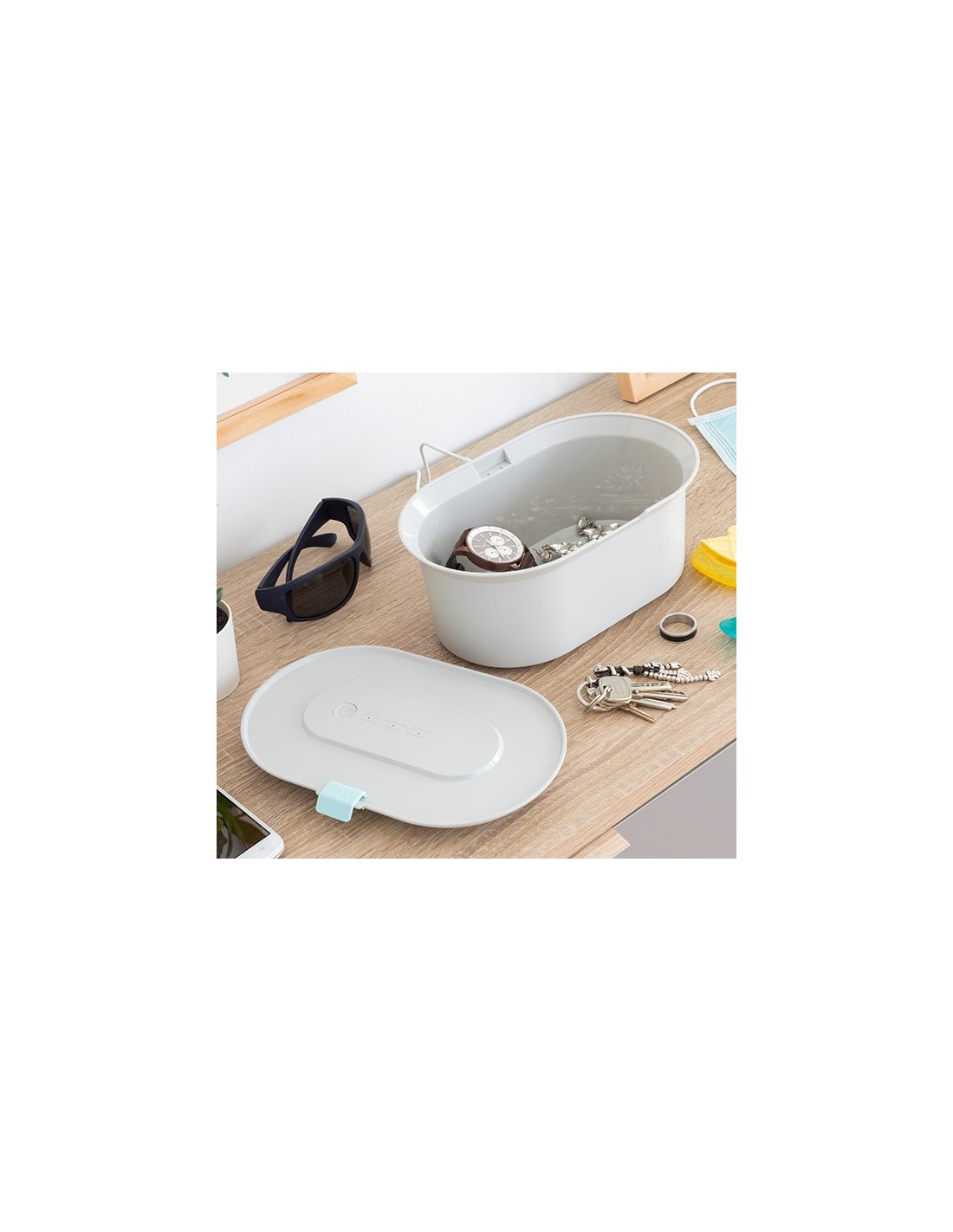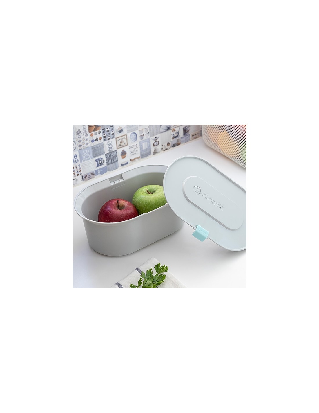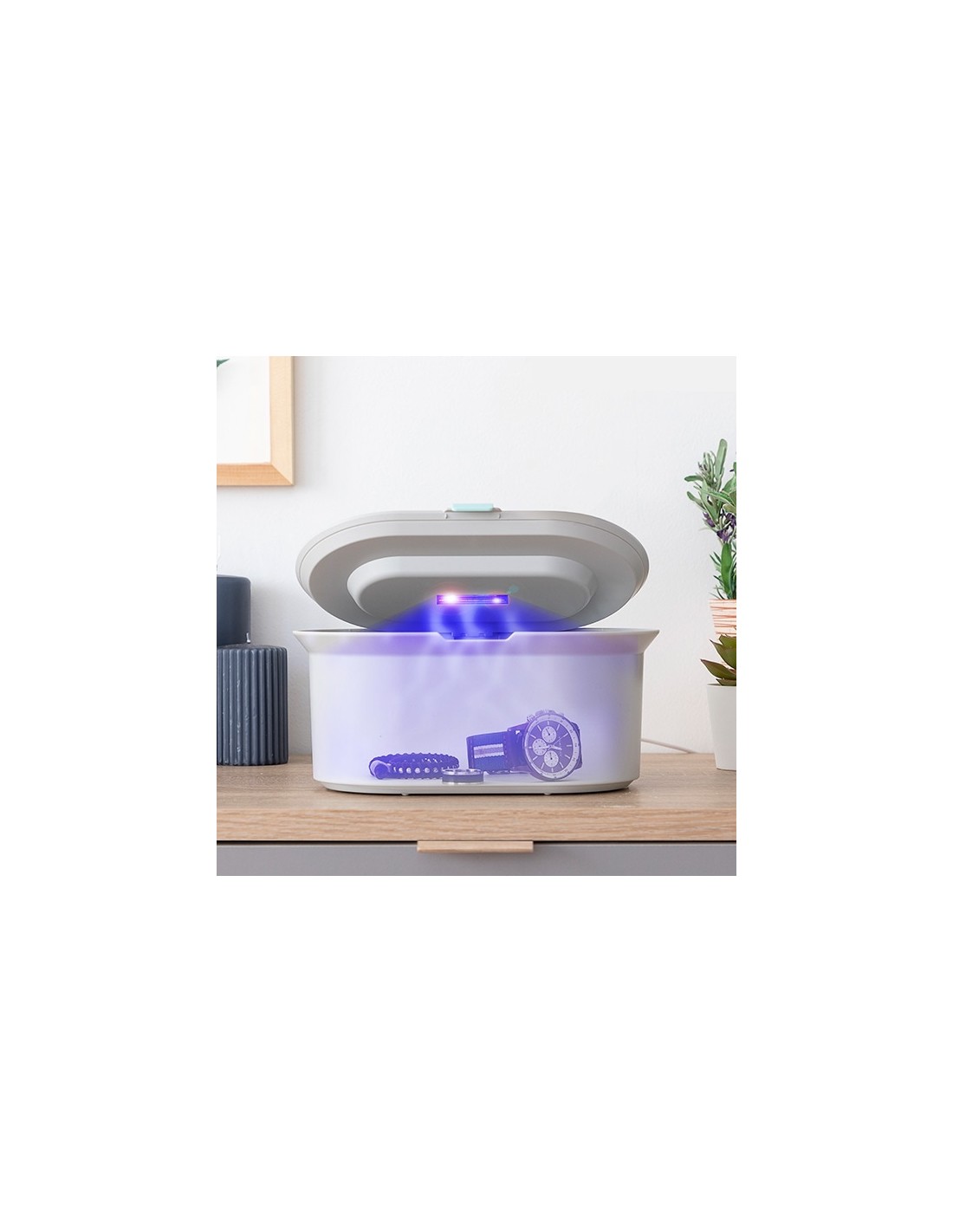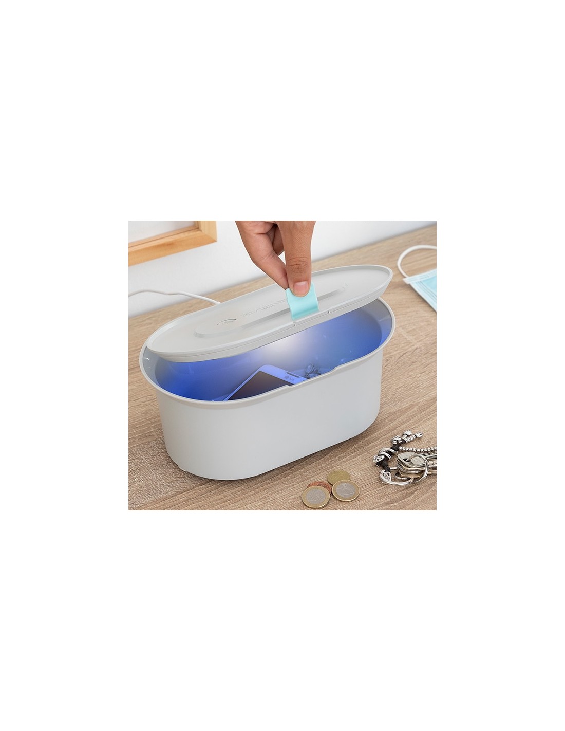 Graças à sua capacidade e design multifuncional, esta caixa de esterilização por UV desinfeta com eficácia uma grande variedade de objetos do dia-a-dia com rapidez e facilidade. Basta depositá-los dentro, apertar um botão e aguardar alguns minutos. Ideal para objetos de uso frequente (máscara, óculos, chaves, carteira, relógio, celular, também alimentos, chupetas e outros produtos para bebês, etc.). Funciona através de uma ligação USB-micro USB e inclui cabo e tem temporizador e desligamento automático de segurança (ao abrir a tampa o processo pára e a luz ultravioleta apaga).
