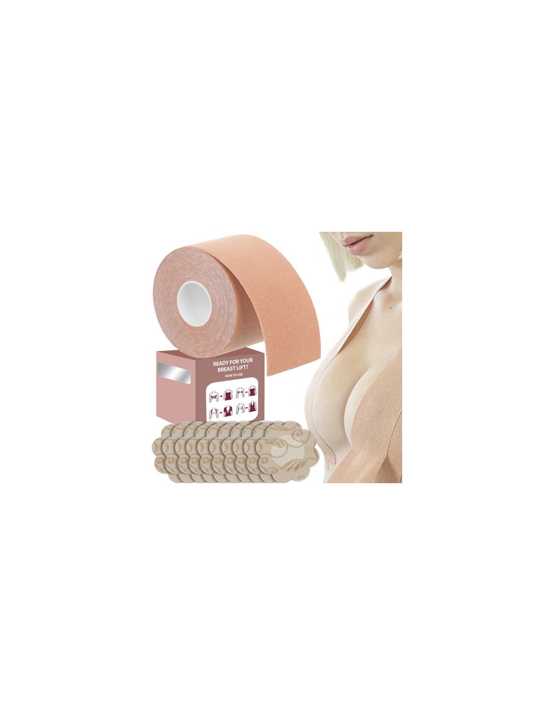 UNIVERSAL - Você sempre teve medo de roupas com decote profundo ou costas abertas devido ao tamanho dos seus seios? Agora você não precisa se preocupar com seus seios muito pequenos ou muito grandes. A fita dará forma facilmente a um busto pequeno e manterá os seios em tamanhos maiores. As fitas possuem um adesivo extremamente forte que funcionará mesmo nas situações mais extremas. Graças a este gadget , você pode usar todas as roupas sem restrições.